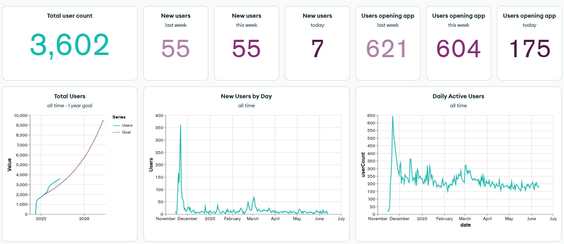 Impact Viz transformed Crossroads' MongoDB test user data into a live, interactive Google Sheets dashboard in time for launch. This gave the team real-time visibility into new sign-ups and app usage starting day one. It was clean, functional, and immediately helpful for spotting traction.As Crossroads gained users, the data outgrew Google Sheets. Rather than pivot to a costly analytics platform, we moved to MongoDB’s built-in data visualization tools. Though we were unfamiliar with the platform, we designed a sustainable dashboard that kept costs low – avoiding new software subscriptions that would chip away at the team’s limited resources – and aligned with the team’s actual data needs.