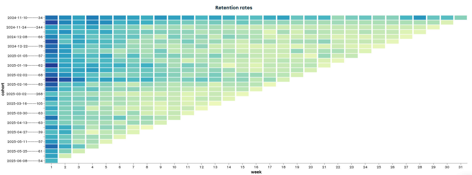 • Cohort retention analysis (Were people still opening the app a week or two after signing up?)